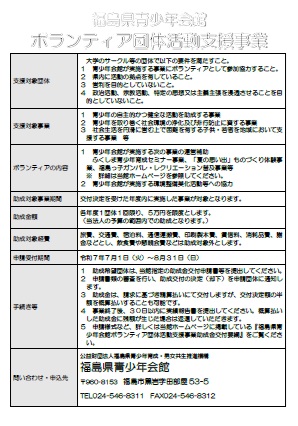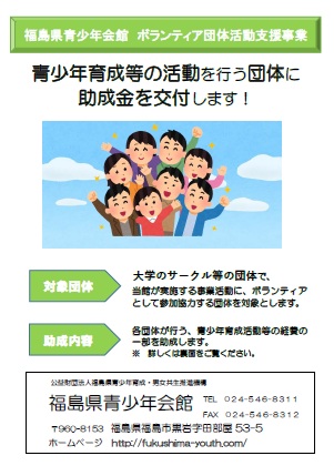 (5) 申請様式など詳細は 『福島県青少年会館ボランティア団体活動支援事業助成金交付要綱』 をご覧ください