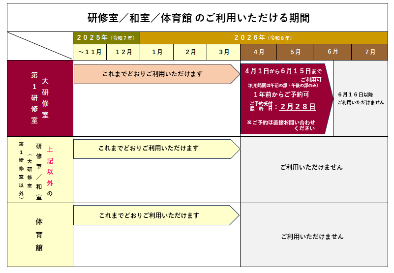 本館および体育館の、令和7年度・8年度のご利用につきましては次のとおりです。